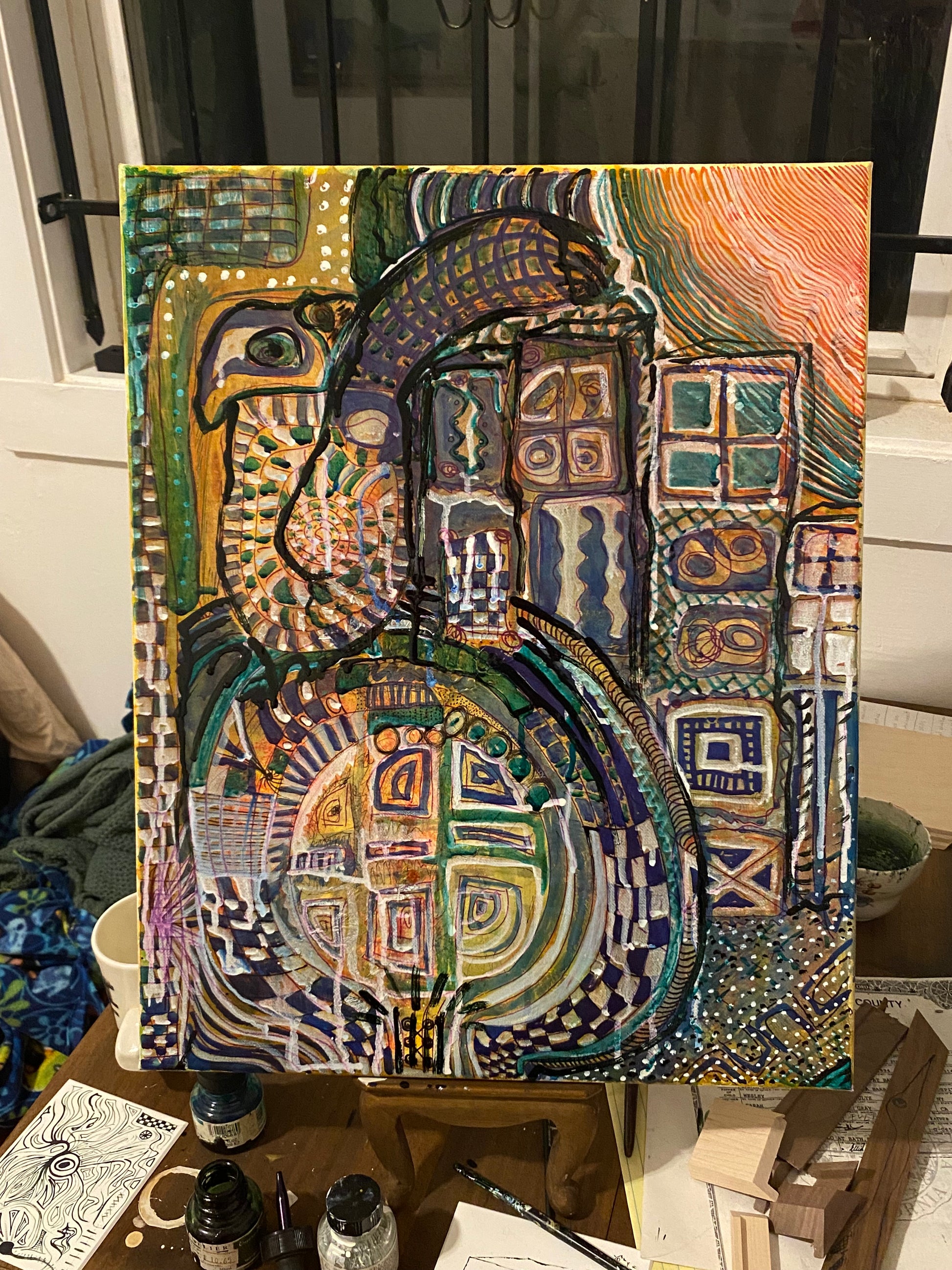 Acrylic, ink, watercolor on canvas.